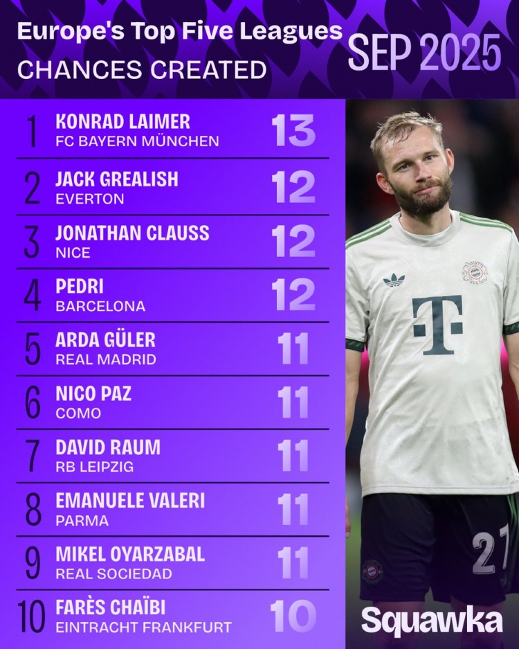 10月1日讯 Squawka统计了欧洲五大联赛球员在9月份的创造机会次数榜单,拜仁中场莱默尔位列第一。