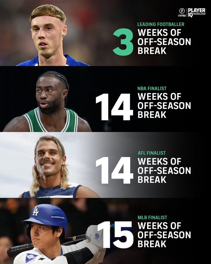 报告指出,一名顶级足球运动员的休赛期仅为3周,而相比之下,进入NBA总决赛的篮球运动员、AFL决赛的澳式橄榄球运动员以及MLB决赛的棒球运动员,其休赛期分别长达14周、14周和15周。