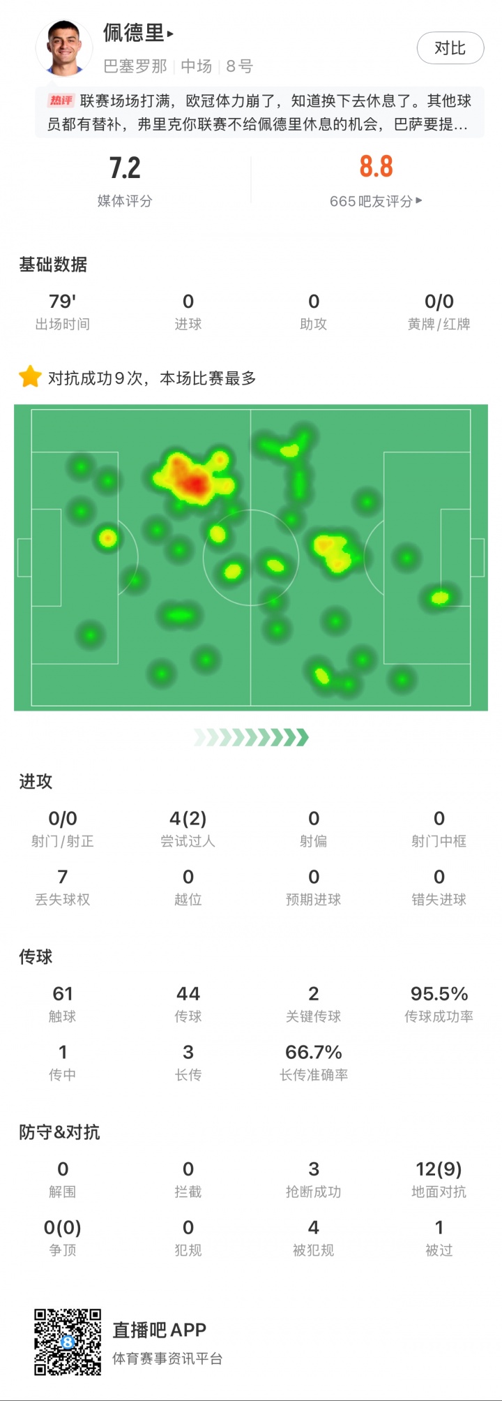 本场比赛,佩德里出战79分钟获评7.2分,4次尝试过人2次成功,7次丢失球权,61次触球,44次传球42次成功,传球成功率95.5%,2次关键传球,3次长传2次成功,长传准确率66.7%,3次抢断成功,12次地面对抗9次成功(全场最多),4次被犯规,1次被过。