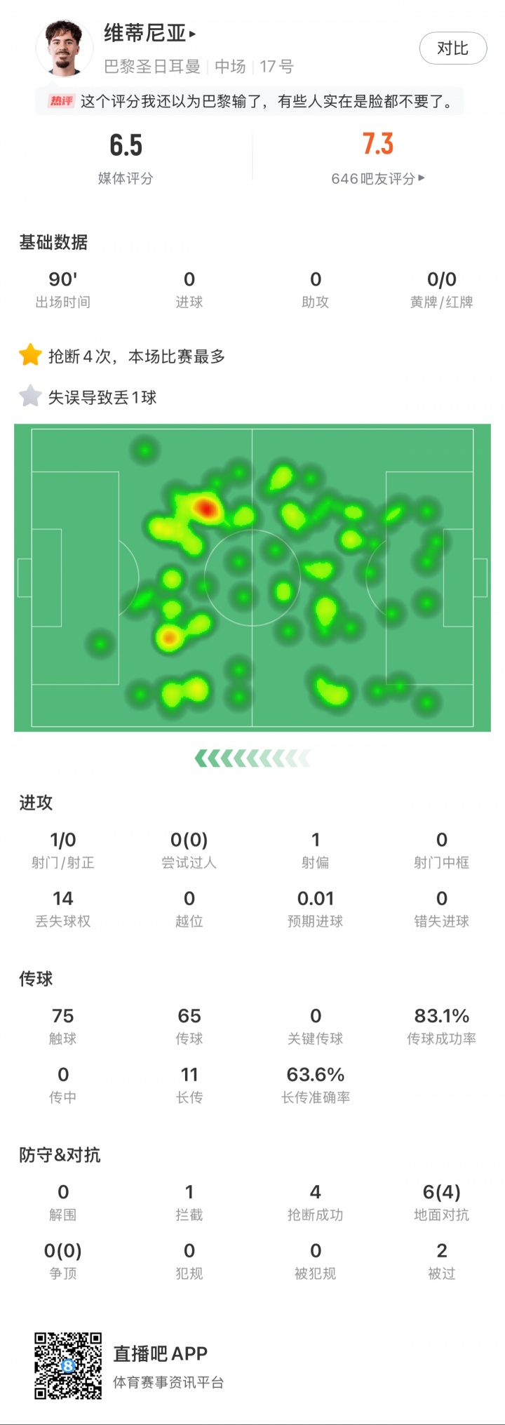 维蒂尼亚则是打满全场获评6.5分,1次射门0射正,14次丢失球权,75次触球,65次传球54次成功,传球成功率83.1%,0次关键传球,11次长传7次成功,长传准确率63.6%,1次拦截,4次抢断成功(全场最多),6次地面对抗4次成功,2次被过,1次失误导致丢球。