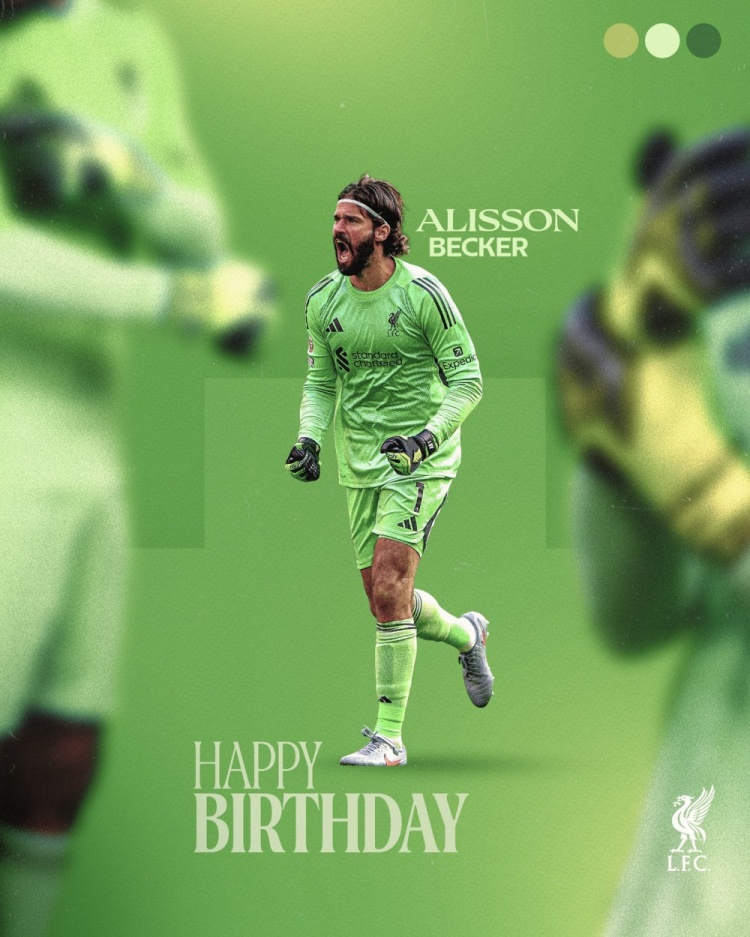 利物浦官方社媒晒出为阿利森制作的生日海报,配文:“生日快乐,阿利森。”