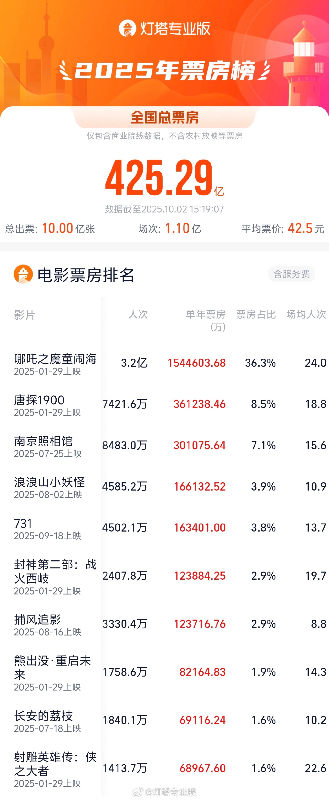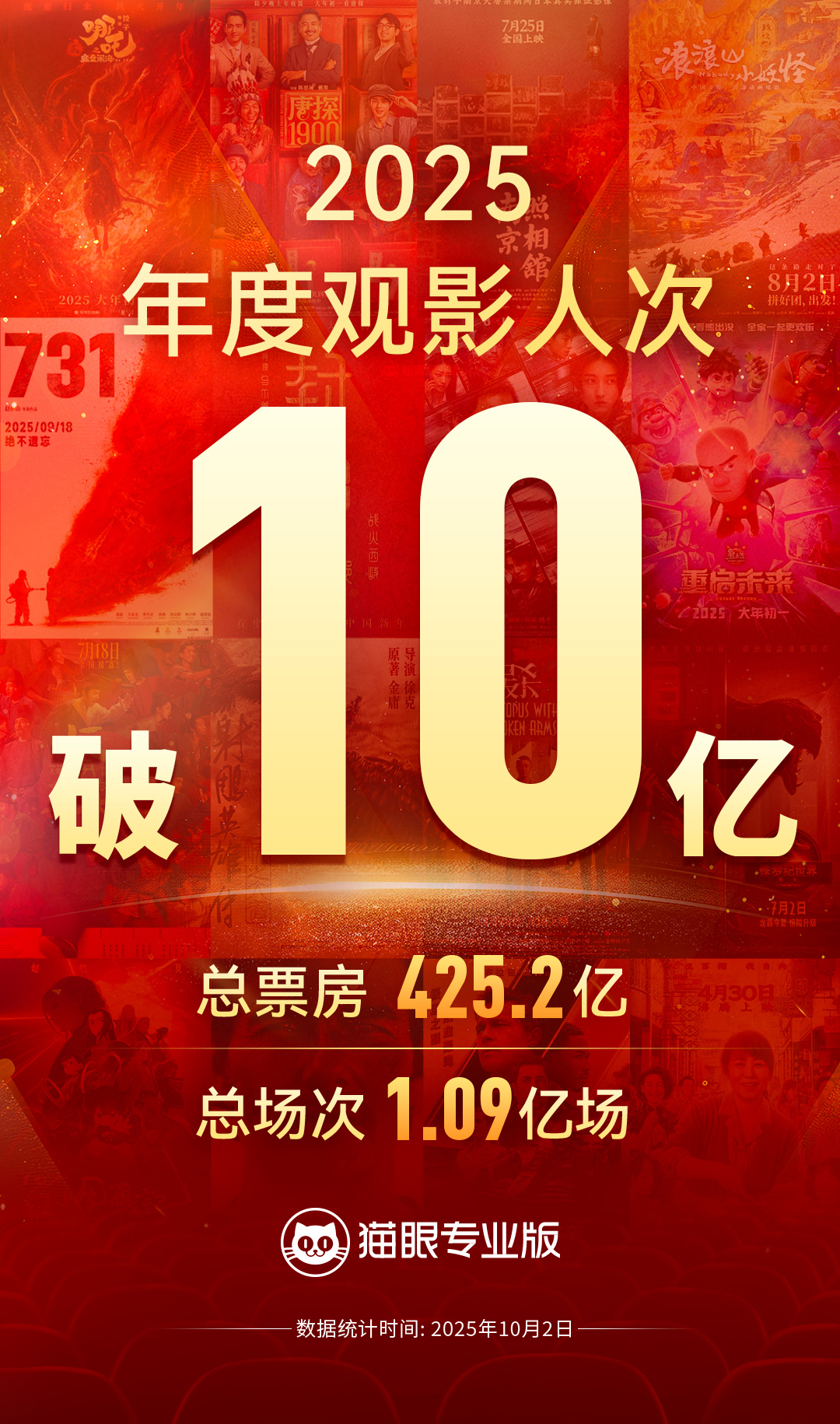 10 月 2 日消息,据灯塔专业版数据,截至 2025 年 10 月 2 日 15 时 19 分,2025 年全国观影人次(含预售)突破 10 亿。