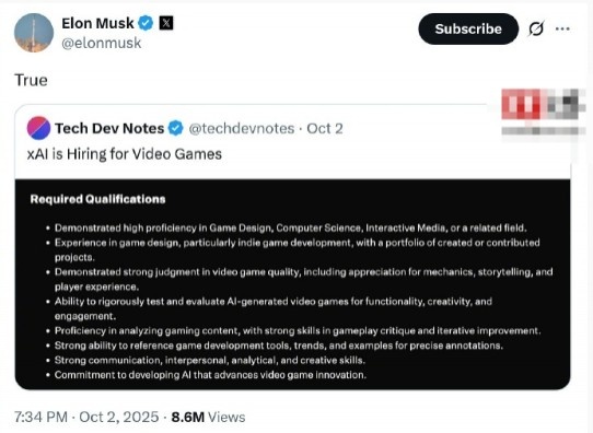 10月3日讯 埃隆・马斯克确认 xAI 正招募游戏开发者;