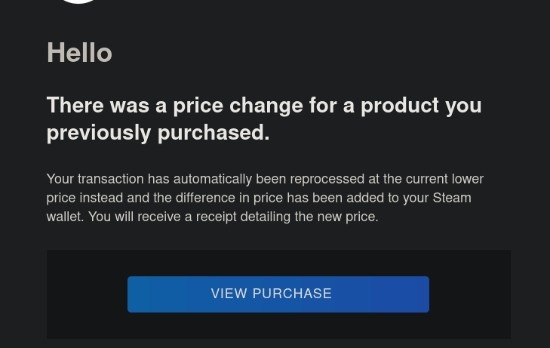 根据图片来看,Steam提示称:“您曾购买的商品发生了价格变动。我们已按当前更优惠的价格自动为您重新处理交易,差价将退还至您的Steam钱包。您将收到详细显示新价格的开票。”
