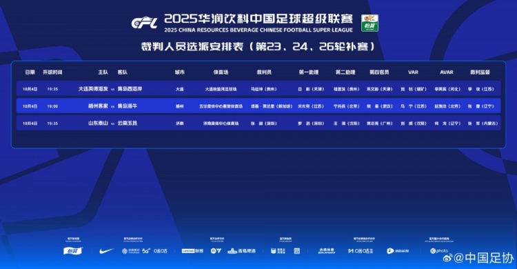 另外两场比赛,大连英博vs青岛西海岸的主裁是马运坤,而山东泰山vs云南玉昆的主裁则是张超,两场的VAR视频裁判分别为刘钊和刘威。