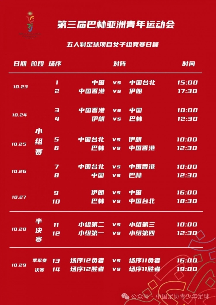 10月4日讯 10月22日-10月31日,第三届亚洲青年运动会(以下简称“巴林亚青会”)将在巴林举行,本届比赛首次将五人制足球纳入正式比赛项目,中国队分别派出男、女队参赛。近日,巴林亚青会组委会公布五人制足球项目竞赛日程。
