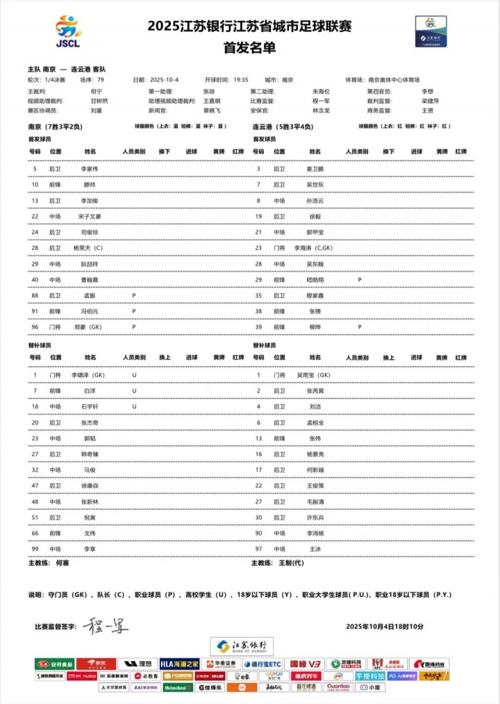 10月04日讯 “苏超”首轮淘汰赛,南京队对阵连云港队的首发已经公布,其中南京队派出了现效力于青岛海牛队的冯伯元首发出场。