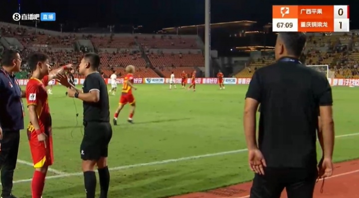 现场字幕给出VAR介入了此次判罚,可能要判给广西点球,然而现场事故不断。