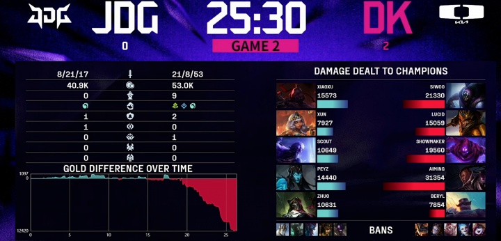 两场比赛,第一场JDG前期优势但是被翻盘,次局DK更是全程碾压拿下比赛胜利。