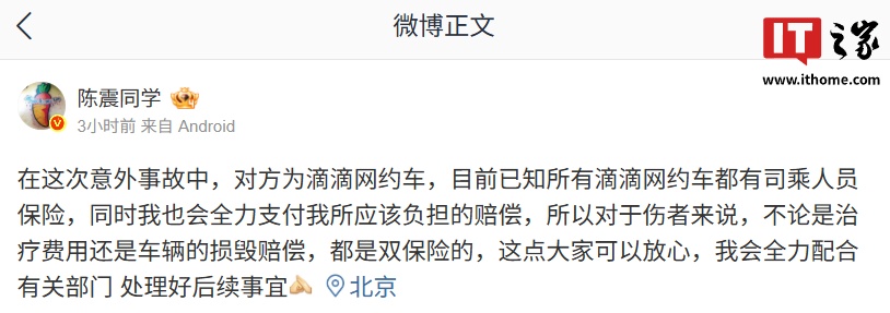 另外,陈震还针对此次事故的赔偿事宜作出回应,他表示对方为滴滴网约车,目前已知所有滴滴网约车都有司乘人员保险,同时自己也会全力支付所应该负担的赔偿,对伤者来说是双保险,微博原文如下: