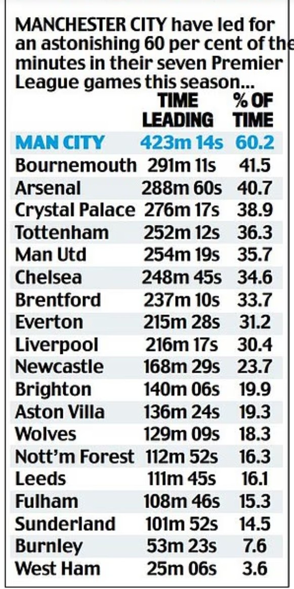 尽管目前在积分榜上只能位居第5,但曼城的领先时间达到了423分钟14秒,占总比赛时间的60.2%,伯恩茅斯、阿森纳和水晶宫是前四中的另外三支球队。曼联目前在积分榜上位居第10位,但他们在比赛中的领先时间可以在20支球队中位居第5。