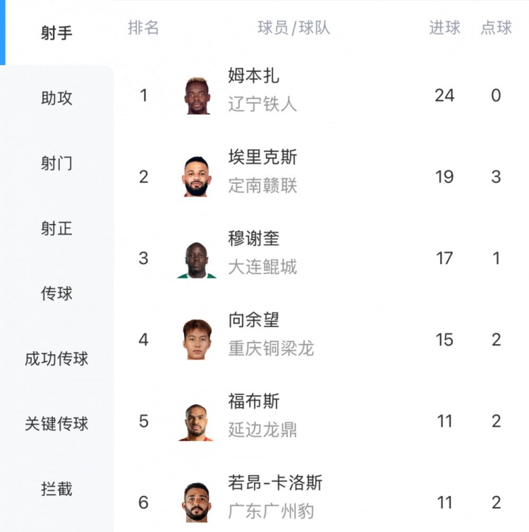 10月6日讯 中甲联赛25轮战罢,射手榜方面,本轮双响的姆本扎24球领跑,本轮分别进球的埃里克斯和向余望分居第二和第四位。