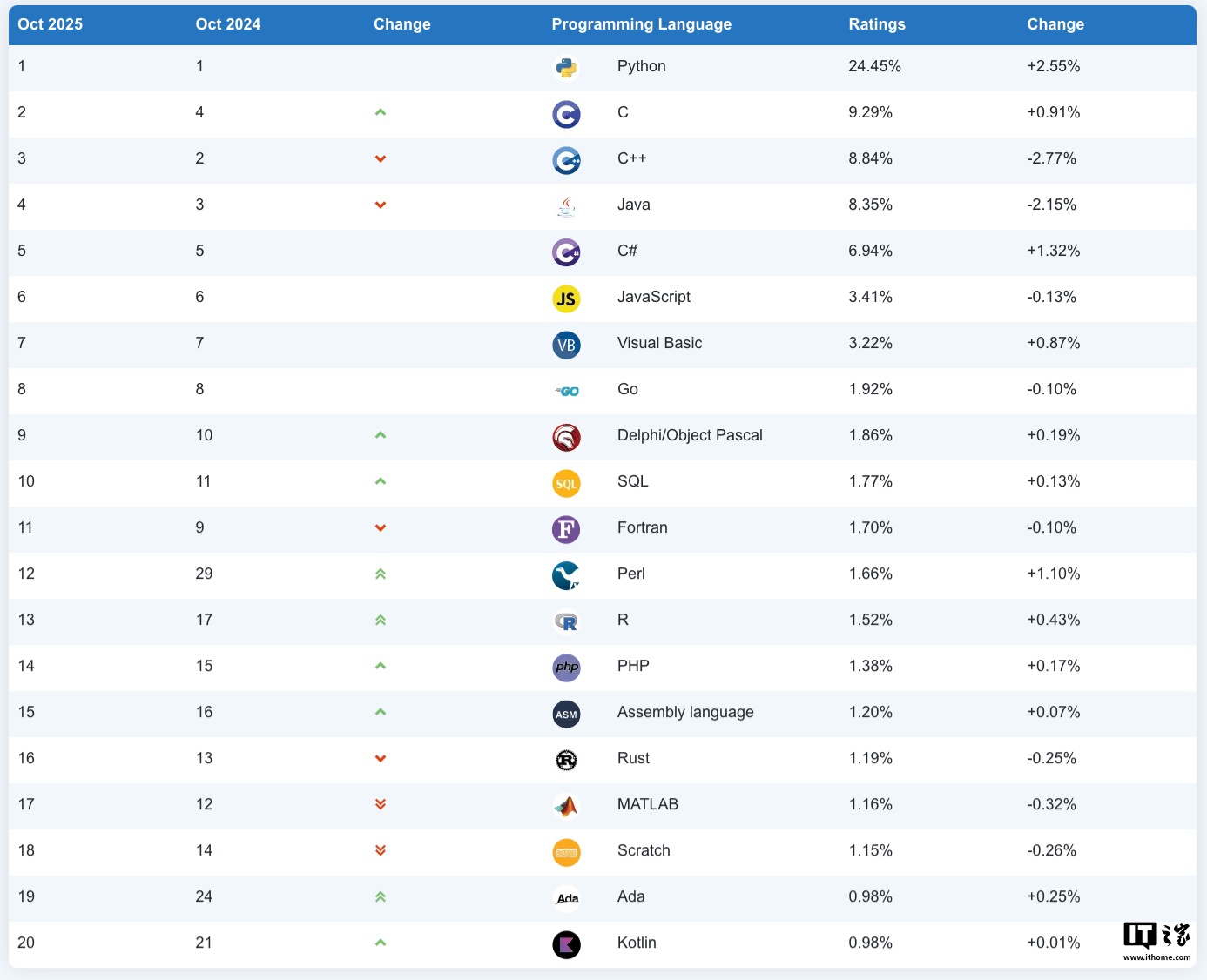 10 月 7 日消息,TIOBE 编程社区指数是一个衡量编程语言受欢迎程度的指标,评判的依据来自世界范围内的工程师、课程、供应商及搜索引擎,目前 TIOBE 官网公布了 2025 年 10 月的编程语言排行榜,整理如下: