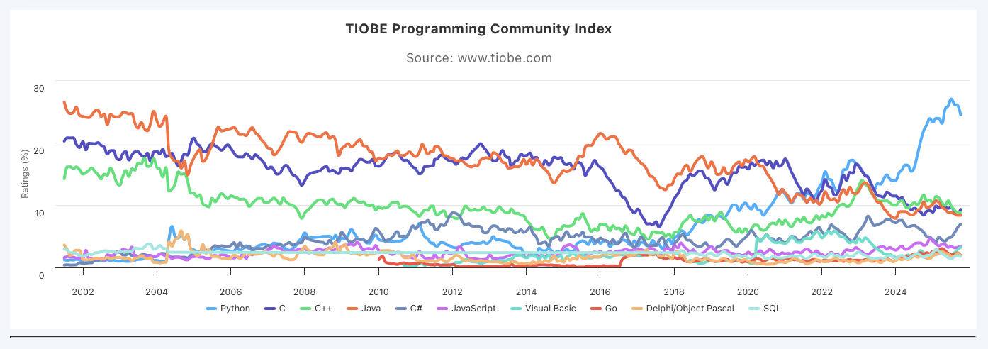 本月,C 语言凭借 C23 版本的发布重回第二。但 Java 刚推出了 Java 25 版本,而 C++ 也在忙于 C++26 版本的更新,因此谁能最终占据第二名仍难以预测。这三种语言各有优势:C 语言简单且执行速度极快,C++ 性能高且适合大型嵌入式系统,Java 则适合大型企业级应用。