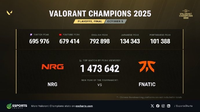 10月8日讯 据国外Esports Charts数据网站统计,瓦罗兰特巴黎全球总决赛的峰值观众为147w,不及CS2 Major和英雄联盟MSI。