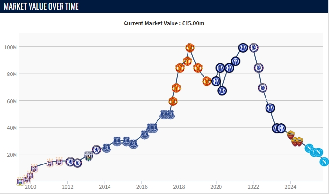 卢卡库曾在效力曼联和国米时身价达到1亿欧,那时他分别是25岁和28岁。切尔西在2021年曾为他支付1.13亿欧,但是买入之后只用了一个赛季,后面接连租借国米和罗马并最终卖给那不勒斯。