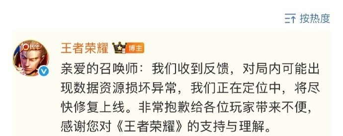 王者荣耀官方账号回应称“亲爱的召唤师:我们收到反馈,对局内可能出现数据资源损坏异常,我们正在定位中,将尽快修复上线。非常抱歉给各位玩家带来不便,感谢您对《王者荣耀》的支持与理解。