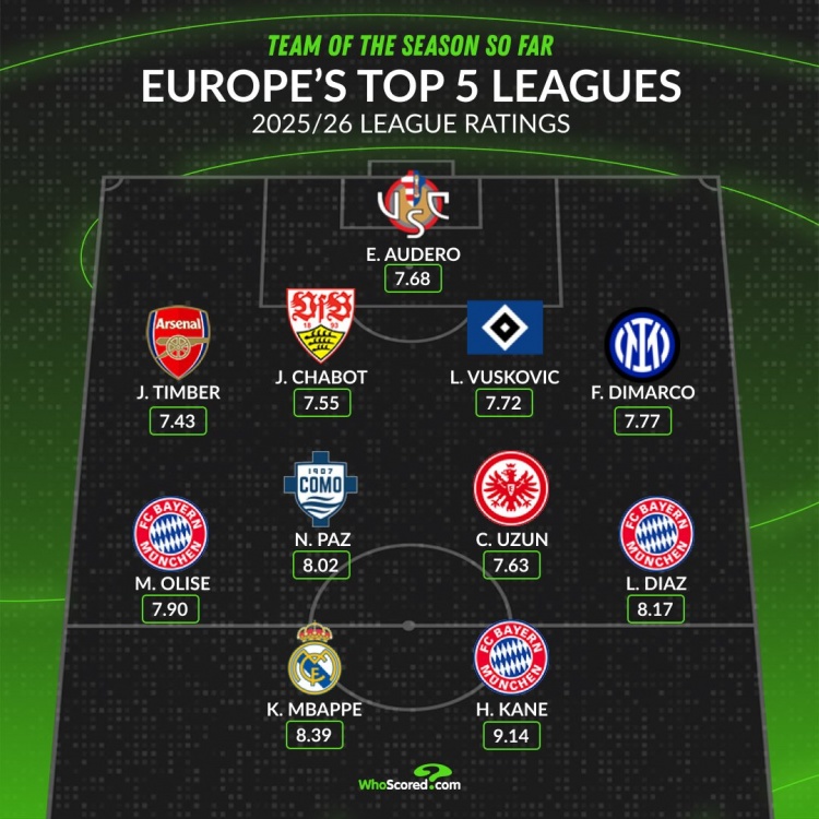 10月8日讯 WhoScored根据球员的场均评分列出了本赛季至今五大联赛最佳阵容,姆巴佩、凯恩领衔,迪亚斯、奥利塞、迪马尔科、廷伯在列。