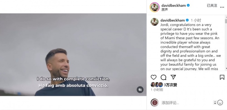 10月8日讯 阿尔巴将在本赛季结束后退役,迈阿密国际老板贝克汉姆社媒发文致敬。