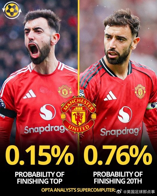 Opta超算预测,本赛季曼联英超垫底概率0.76%,大于夺冠概率0.15%