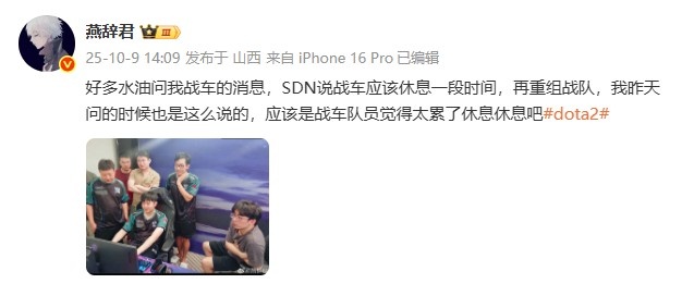 10月9日讯 DOTA2博主“燕辞君”谈Tidebound战队的消息;