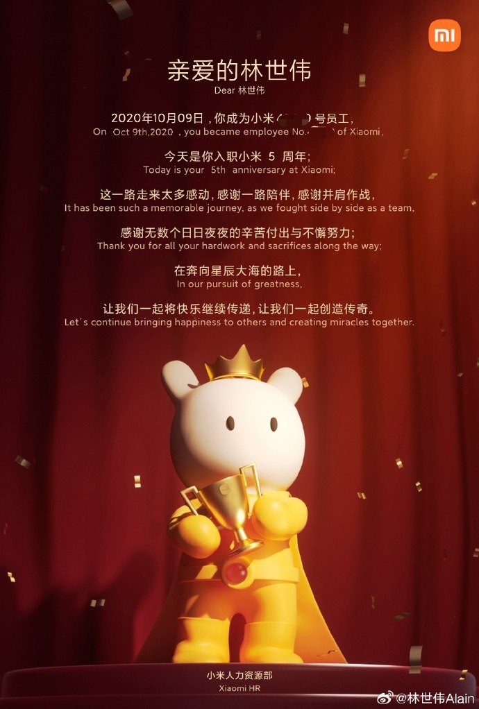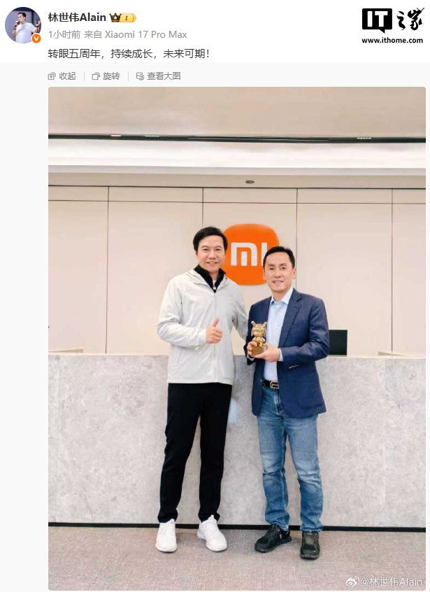10 月 9 日消息,小米集团副总裁、首席财务官林世伟今天发文纪念自己入职 5 周年,并晒出了雷军亲自为其颁发“金米兔”的合照。