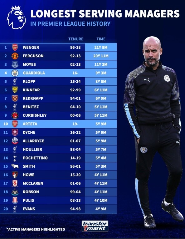 10月9日讯 德转列出了英超历史上的主帅任职时长榜,温格、弗格森前二,瓜迪奥拉第四,克洛普第五。