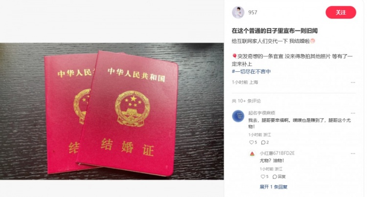 957官宣结婚喜讯:给互联网的家人们交代一下 我结婚啦