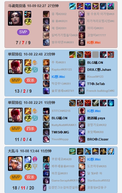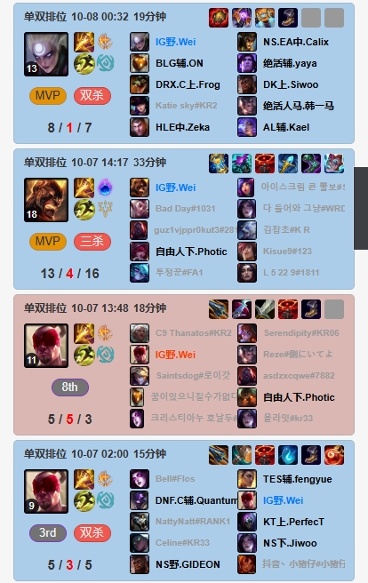 而韩服排位数据小程序显示,iG打野Wei目前已经打上韩服前十。