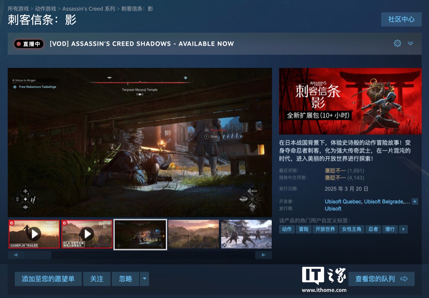 回顾《刺客信条:影》,本作是《刺客信条》系列的第 14 部主线作品。游戏中玩家将扮演伊贺女刺客“藤林奈绪江”或侍从“弥助”,经历一段扑朔迷离的古日本剧情。目前在 Steam 国区上售价 348 元起,好评率 77%“多半好评”,简体中文评测 69%“褒贬不一”。