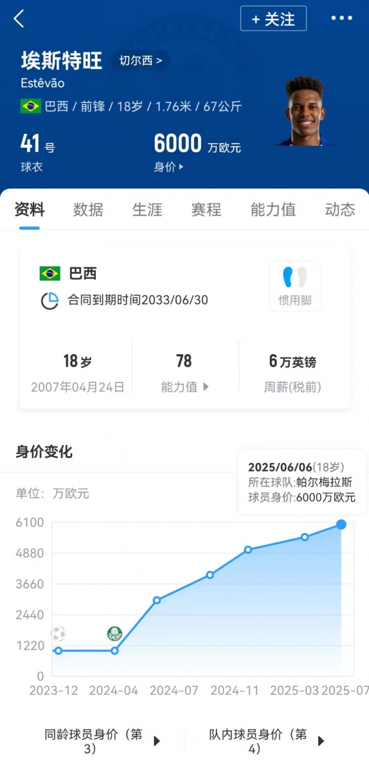 在埃斯特旺16岁时,德转为其设定的起步身价就达到了1000万欧;2年间他的身价已经一路上涨来到了6000万欧,在2007年出生的同龄人中仅次于亚马尔和库巴西。
