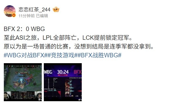 10月11日讯 亚洲邀请赛WBG被BFX淘汰,圈内人“恋恋红茶”发文:BFX 2:0 WBG