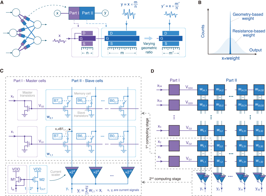 该方案将模拟计算权重的实现方式从不稳定、易受环境干扰的物理参数(例如器件电阻)转向高度稳定的器件几何尺寸比,突破了限制模拟计算精度的瓶颈。