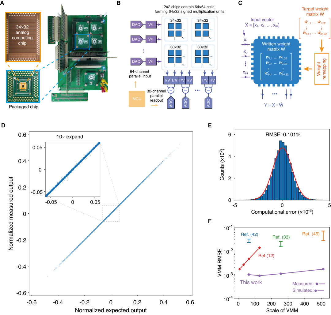 ▲ 图 2:高精度模拟向量-矩阵乘法测试。(A) 芯片和测试电路照片。(B) 模拟向量-矩阵乘法精度测试电路原理图。(C) 权值重映射方法示意图。该方法能进一步提高芯片计算精度。(D) 1500 组随机向量-矩阵乘法结果。理想输出与实际输出几乎重合。(E) 归一化计算误差的分布图,统计得其均方根仅为 0.101%。(F) 本芯片与其他先进模拟计算方案的精度对比。
