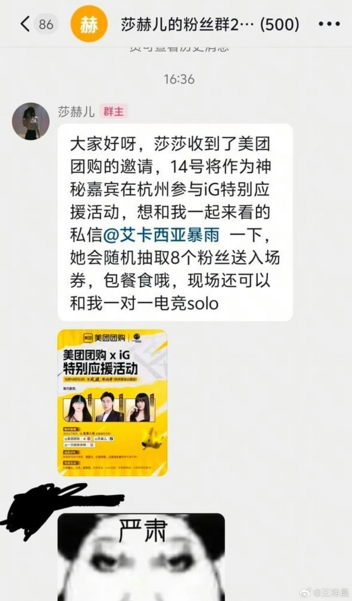 10月12日讯 14号IG对T1决出最后一张S赛门票资格,模仿Faker的莎赫儿原本被美团邀请参加的杭州线下观赛活动,但曝光后疑似因舆论问题临时更换人。