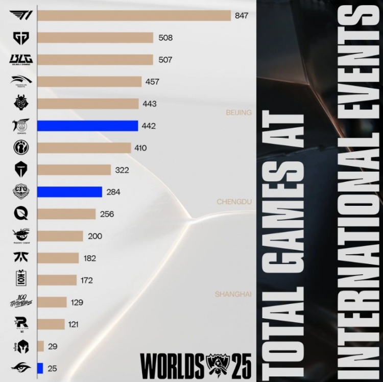 10月12日讯 LCP官推发布本次世界赛各战队选手参加国际赛事(先锋赛/MSI/S赛)场次之和,T1居首,GEN第二,BLG位列第三;