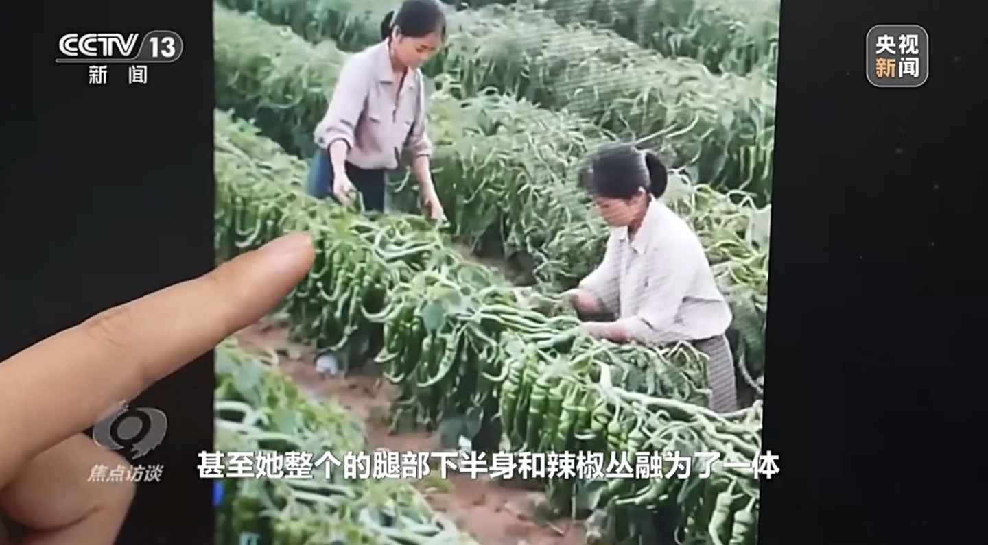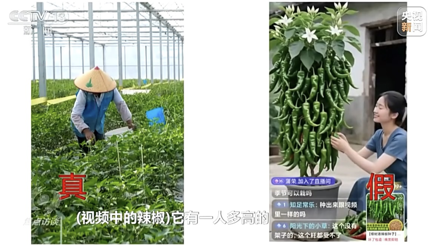 然而就在主播回答提问的时候,背景视频却出现了农户站在快要没过膝盖的深水中采摘辣椒的场景,这样的场景显然不符合常理,而类似的画面在其他直播间也有出现,当记者追问这些场景是不是 AI 生成的时,主播并没有正面回应。