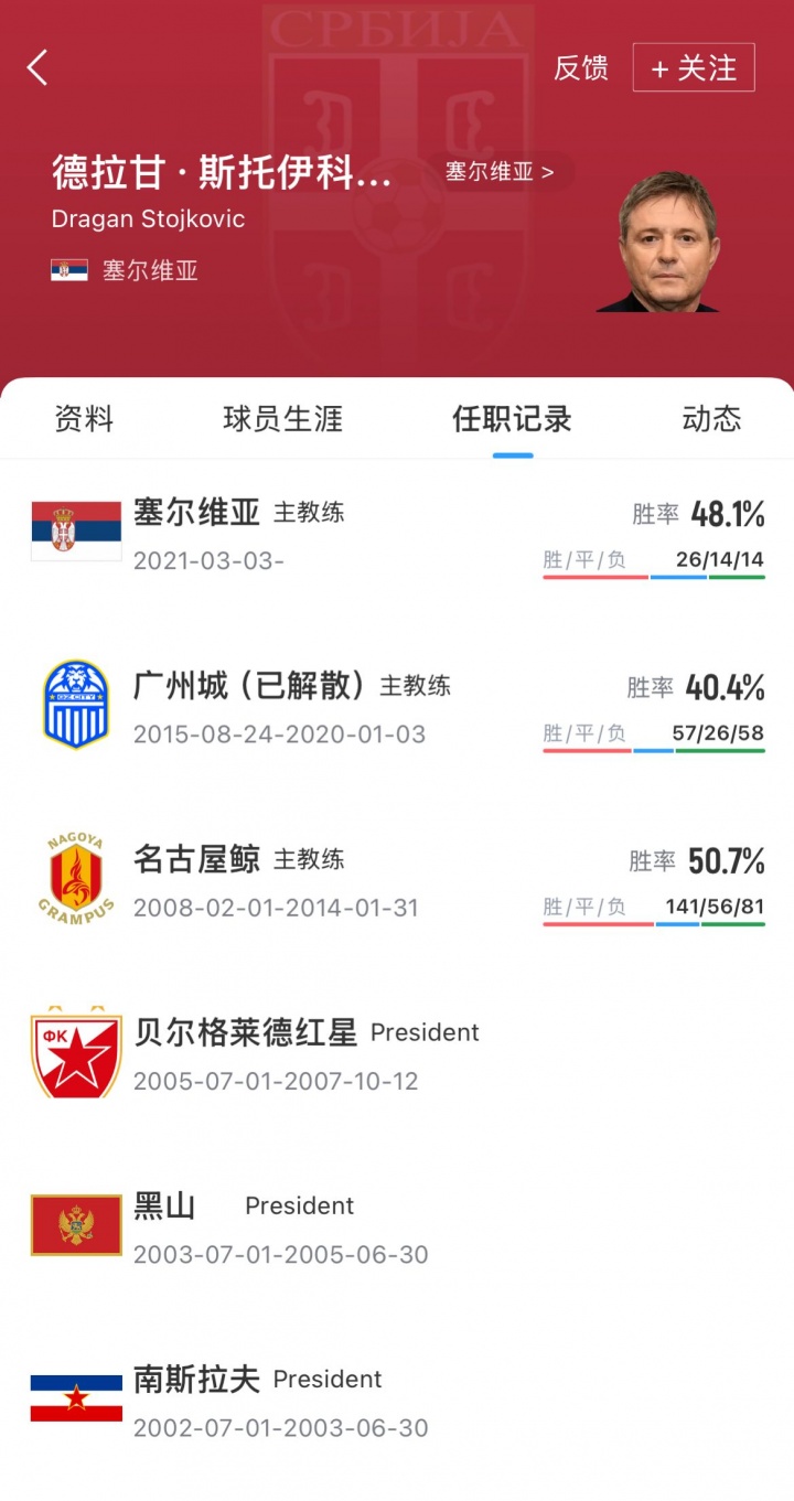 塞尔维亚籍教练德拉甘·斯托伊科维奇,从2021年3月起执教塞尔维亚国家队,共取得26胜14平14负的战绩,目前塞尔维亚在世预赛欧洲区K组中排名小组第3。在斯托伊科维奇的教练生涯中,他还曾执教过名古屋鲸、中超广州城等球队。