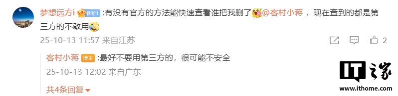 还有网友希望微信官方推出快速查看“谁把我删了”的方法,@客村小蒋 对此表示:最好不要用第三方的,很可能不安全。