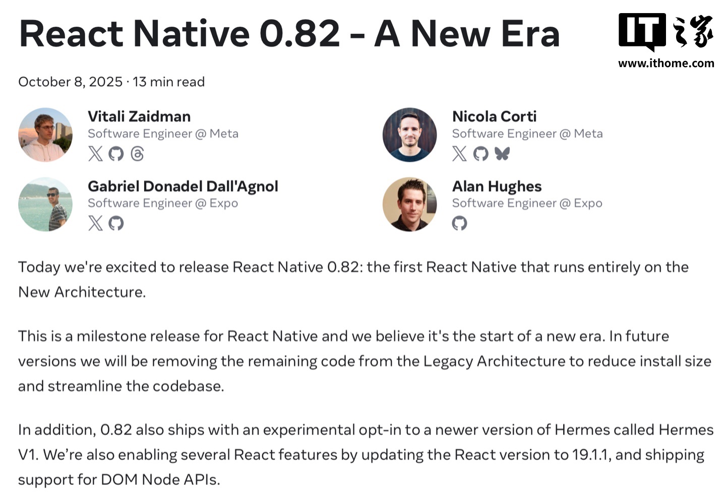 10 月 13 日消息,跨平台应用开发框架 React Native 现已推出 0.82 版本,这是首个仅运行在新架构(New Architecture)下的版本,同步引入 Hermes V1 编译器,并优化了多项开发体验。