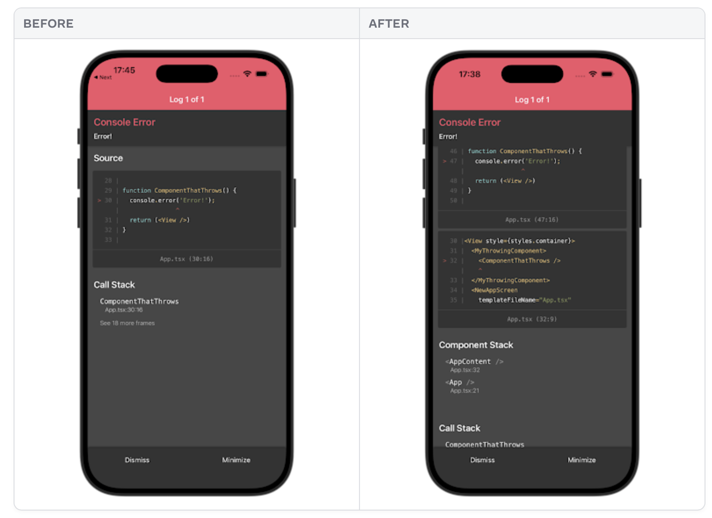 此外,React Native 0.82 内置的 React 19.1.1 版本正式支持 Owner Stacks,修复了部分 Babel 配置下堆栈信息不完整的问题,并改善了 useDeferredValue 与 startTransition 在搭配 Suspense 时的行为一致性。调试体验也进一步优化,错误信息更清晰,能更快定位问题。