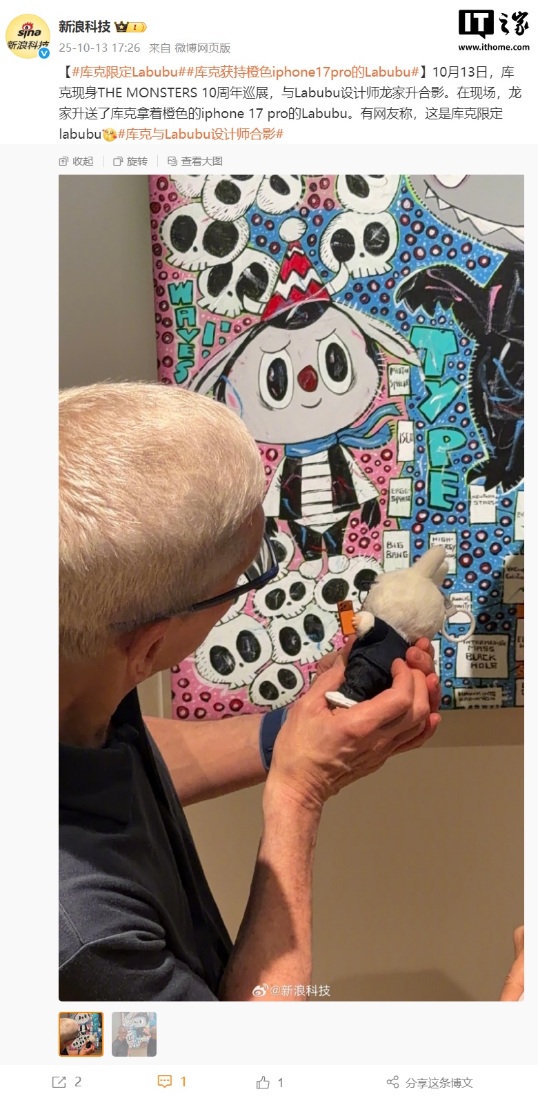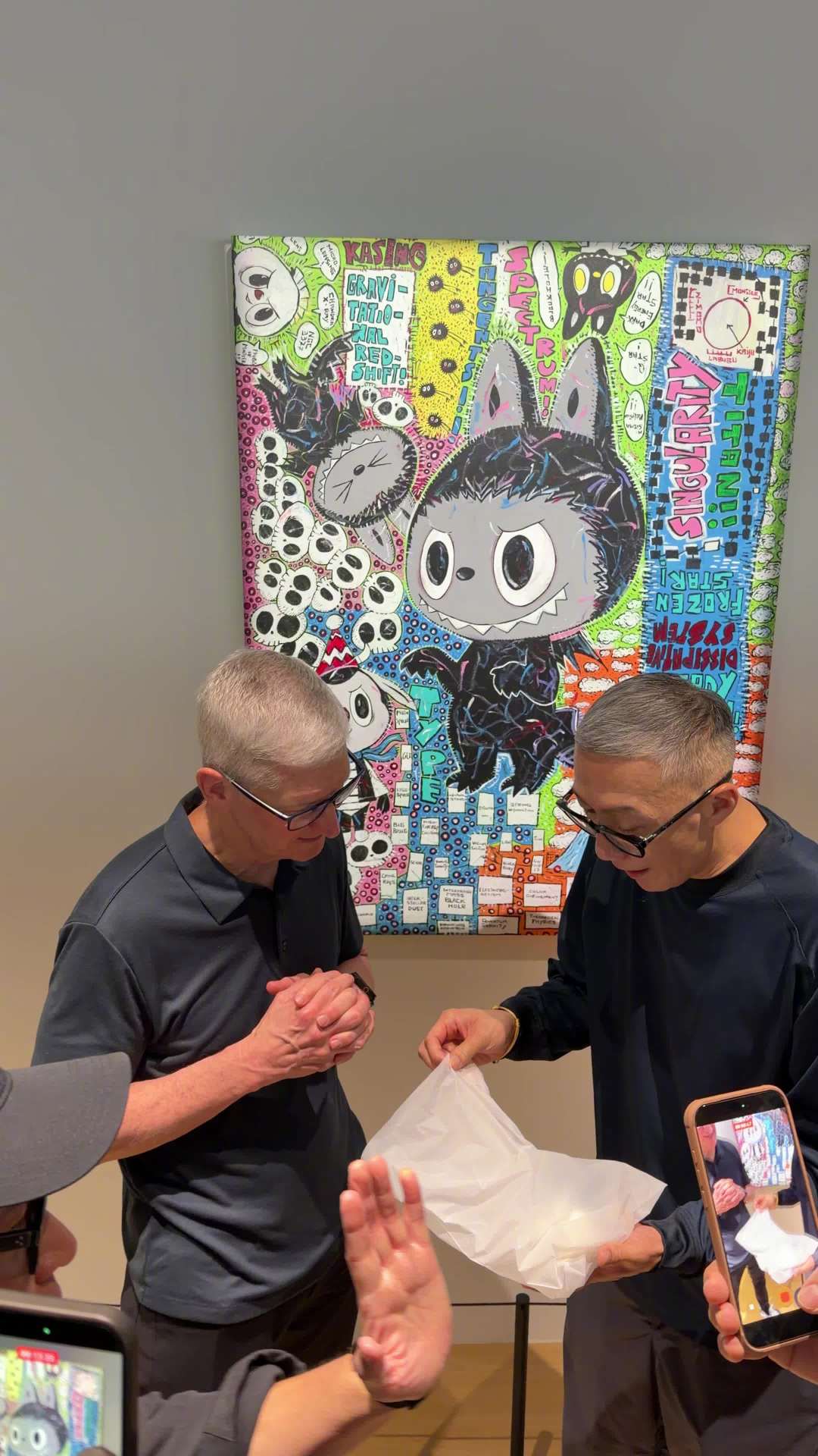 10 月 13 日消息,据新浪科技苹果汇消息,苹果 CEO 库克今日现身 Labubu 的 THE MONSTERS 10 周年巡展,与 Labubu 设计师龙家升合影。
