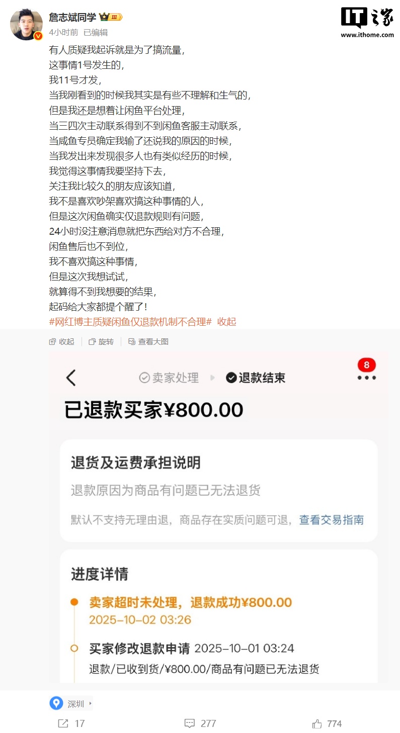 10 月 13 日消息,网红博主 @詹志斌同学 今日在微博发文称,自己在闲鱼平台出售价值 800 元的闲置物品,但买家收货后说物品无法使用,詹先生让其退回,可对方却在平台申请了仅退款。