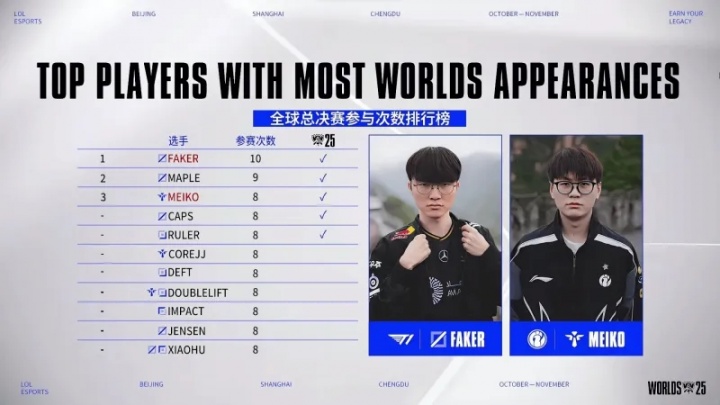 LOL官方对比IG和T1选手参与S赛次数:Faker独占第一