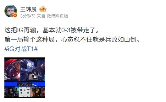 10月14日讯 S15入围赛IG对阵T1,媒体人王玮晨发文谈第二局: