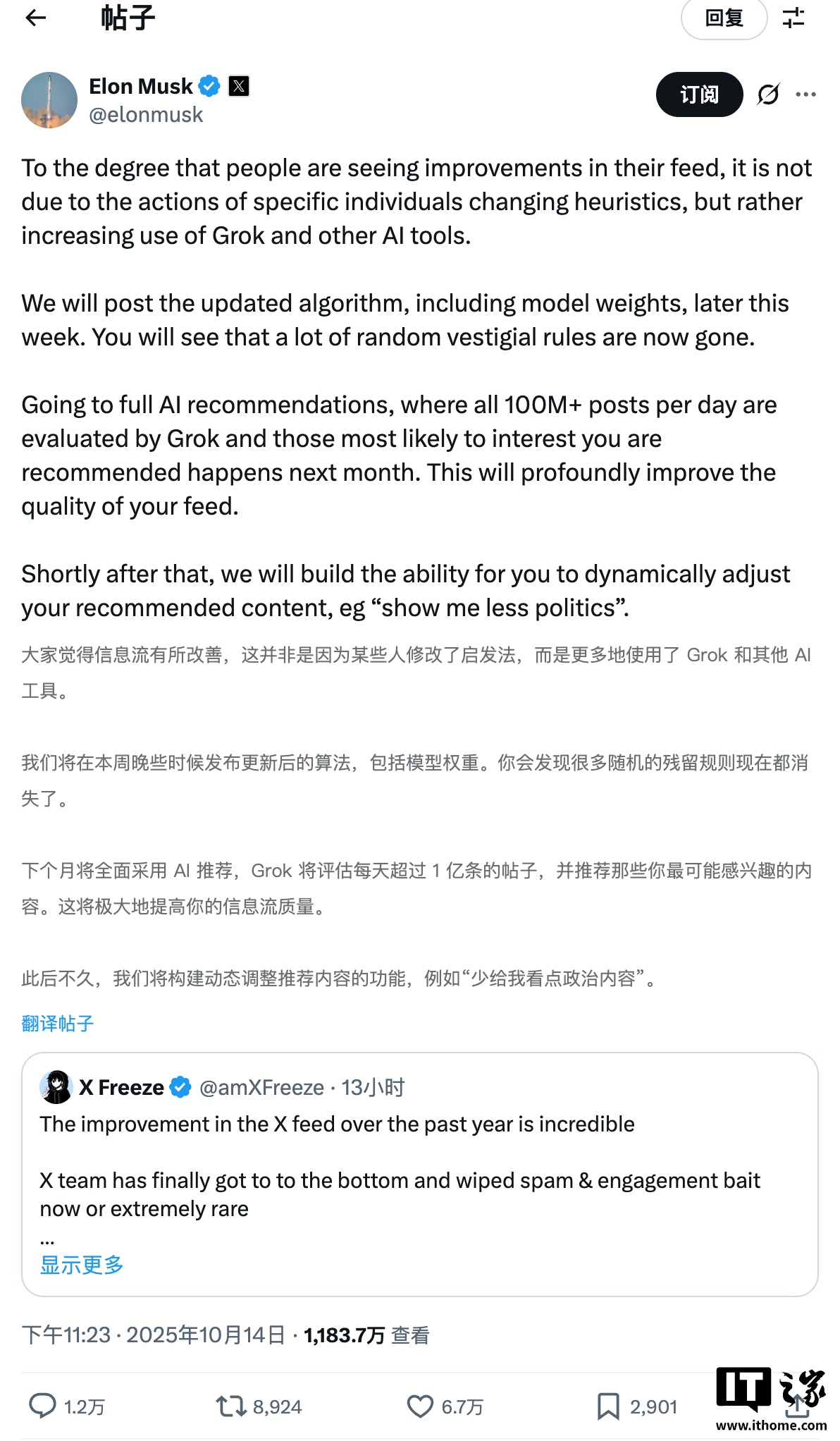 10 月 15 日消息,北京时间昨晚,马斯克在 X 平台发文宣布,将在本周晚些时候发布更新后的算法,包括模型权重。接下来,X 平台将全面采用人工智能推荐,届时每天超过 1 亿条帖子都将由 Grok 进行评估,并推荐那些最有可能让用户感兴趣的内容,从而极大提高信息流质量。