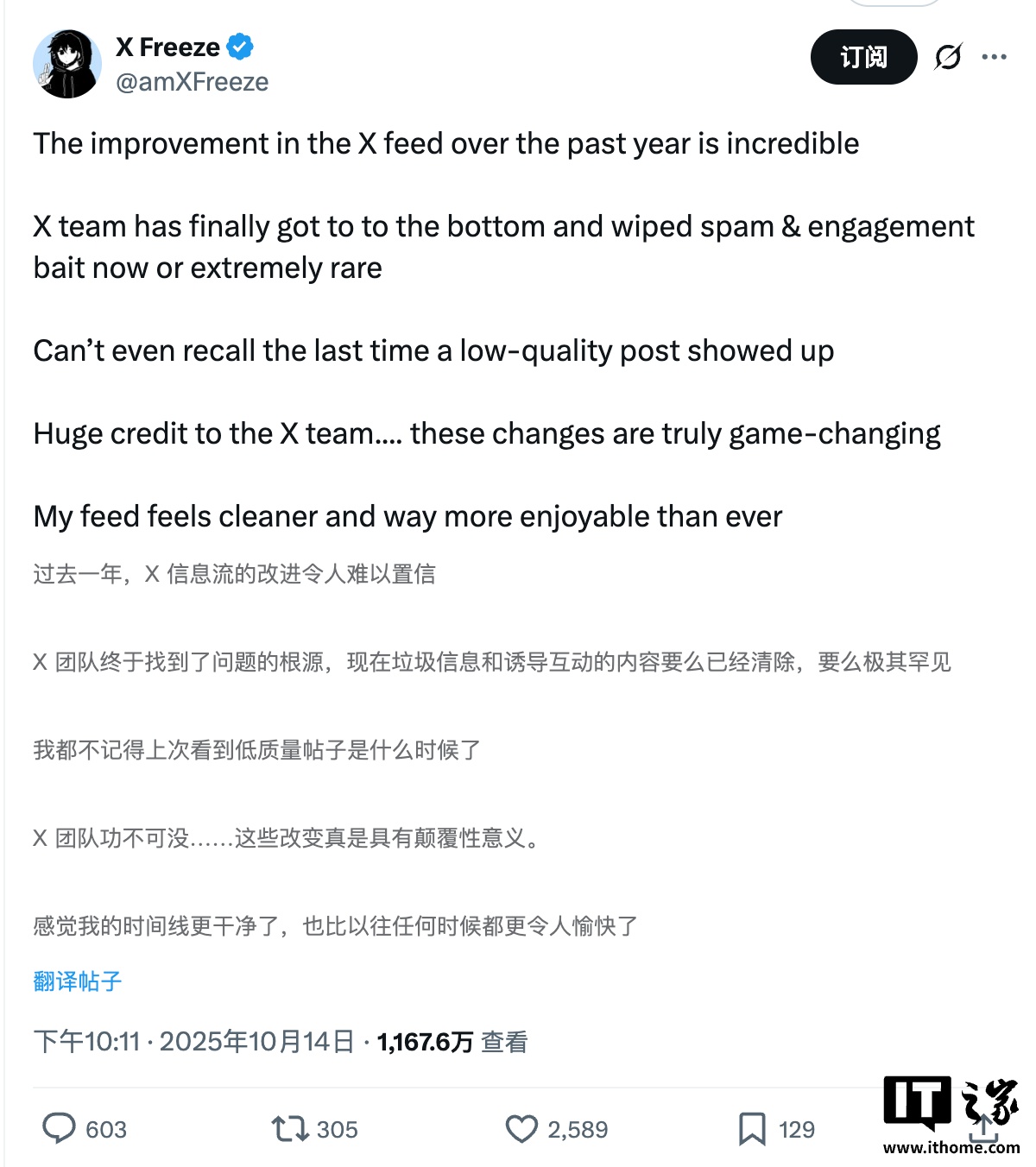 马斯克是在转发一则帖子时作出上述表态的。这则帖子盛赞 X 平台信息流过去一年内的改进“难以置信”,“现在垃圾信息和诱导互动的内容要么已经清除,要么极其罕见。”
