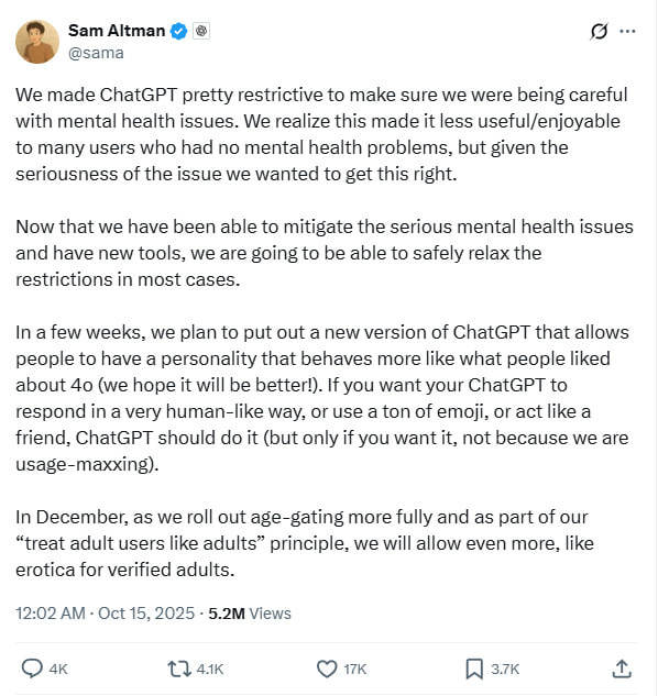 10月15日讯 今日OpenAI 首席执行官在推特发布声明:12月,我们将在更全面推出年龄限制机制的同时,秉持“把成年人当作成年人对待”的原则,允许更多内容上线,例如,为已验证成年用户提供的涩情作品。