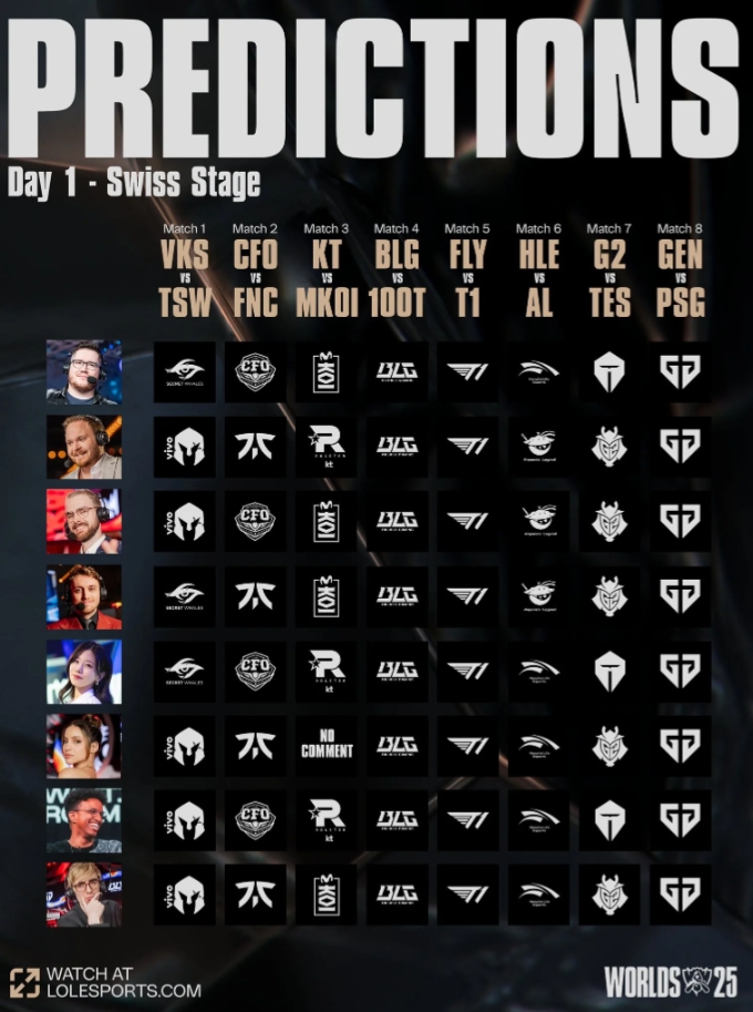 10月15日讯 今日S15世界赛瑞士轮正式开打,赛前LOL官推发布英文流解说瑞士轮首轮预测:全员看好BLG/T1/GEN,但是因为BLG不敌100T,本场全部预测错误!