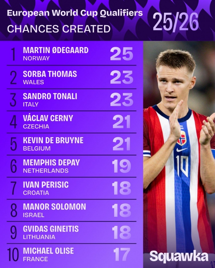 10月15日讯 据Squawka统计,厄德高是本届欧洲世预赛创造机会最多的球员。